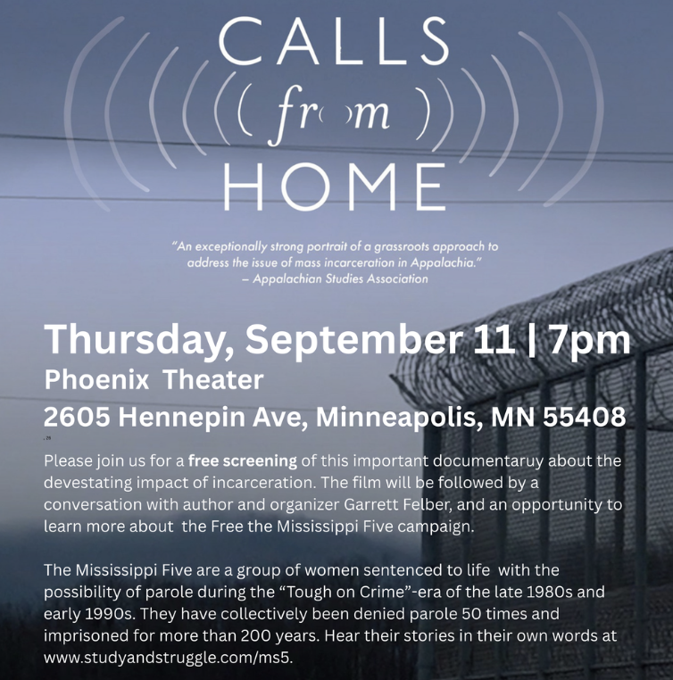 Come join Study and Struggle as we watch Calls From Home and hear from a panel of local and national organizers in solidarity in the campaign to free The Mississippi Five.